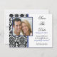 Annoncez votre futur mariage avec nos cartes d'annonce Save The Date avec un magnifique motif damassé noir & blanc avec un cadre photo découpé bleu foncé. Ajoutez simplement vos informations de mariage et votre photo et vous êtes tous prêts à partir ! Correspondance timbres-poste et scellés d'enveloppe disponibles dans notre boutique. Disponible dans un large assortiment de couleurs et vous pouvez aussi choisir votre propre couleur !