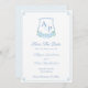 Élégant Bleu et Blanc Enregistrer La Date avec un blason aquarelle avec des hortensias bleus.
