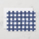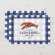 Un mariage nautique rustique sauvez la date avec l'illustration d'un homard sur un motif bleu patiné en vichy avec du texte noir sur le devant.