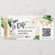 Destination Beach Wedding Boarding Pass Ticket Gold Plane Save the Date with Cruise Ship icon with tropical leaves. Add your QR Code