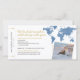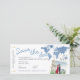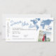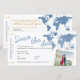 Save the Date Boarding Pass Invitation with a modern dusty blue colour world map, cute boho script handwriting font, and 2 photos with square overlay borders. Use this template to create your own unique travel theme destination wedding date announcement, leave it as shown, or have some fun with DIY design.