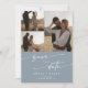 Ce chic boho bleu poussiéreux multi photo code QR enregistrer la carte date est parfait pour un mariage minimaliste. Le design moderne et bohème, bleu clair neutre, présente une calligraphie rustique simple, avec un style unique mais classique. Personnalisez votre enregistrement de la date avec vos noms, date du mariage, emplacement, 4 photos de fiançailles et un code QR qui renvoie à votre site Web mariage.