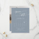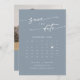 Ce chic boho code QR bleu poussiéreux calendrier photo enregistrer la carte date est parfait pour un mariage minimaliste. Le design moderne et bohème, bleu clair neutre, présente une calligraphie rustique simple, avec un style unique mais classique. Personnalisez votre enregistrement de la date avec le calendrier de votre mois mariage avec un coeur au-dessus de votre date mariage, vos noms, l'emplacement du mariage, une photo de fiançailles et un code QR qui se rapporte à votre site mariage.