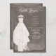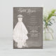 Un design boho amusant a un charme rustique, mais beau. Fabriquée à l'ombre luxueuse d'un taupe profond, cette invitation à la douche dégage une sensation de suède doux. Une robe mariage tout simplement magnifique est accrochée à un cintre avec une paire de canards qui se jettent d'en dessous. Quelques anémones, magnolias et eucalyptus sont astucieusement arrangés pour lui donner un peu de flair. La beauté décontractée est une excellente façon de la décrire. Un choix parfait pour ce mariage de jardin ou de grange ! Customisez simplement les mots et vous êtes tous prêts. Chic Boho ! C'est vraiment un genre.