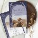 Un désert rustique et boho moderne, mariage audacieux sauvez la date. Tout le texte, les noms et les couleurs arrière - plans sont personnalisables avec 2 photos et photo en arc rustique avec le désert bohème bleu marine poussiéreux, avec éditable herbe de pampa séchée fleurie.