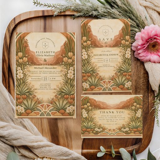 A warm, romantic wedding design inspired by desert landscapes and soft botanical florals. Illustrated wildflowers frame rolling hills in earthy, sun-washed tones, creating a refined boho aesthetic that feels natural, elegant, and timeless. Perfect for couples planning an outdoor, desert, or nature-inspired celebration with customizable details.