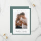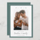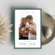 Un élégant et minimaliste enregistrer la conception de la carte de date avec une seule photo verticale sur un arrière - plan blanc avec une fine bordure en écaille verte d'épinette. Personnalisez avec votre date et votre emplacement mariage dans les lettres de bloc modernes, et vos noms dans un script décontracté et chic écrit à la main. Personnalisez le dos de cette conception simple avec des détails supplémentaires, comme votre site mariage.