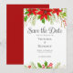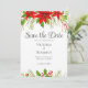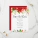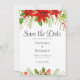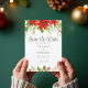 Cette carte classique de sauvegarde de date de mariage de Noël rouge et vert présente des fleurs de poinsettia lumineuses en bas à droite de votre invitation et des baies de houx et de la verdure en haut à gauche. Une invitation botanique festive et lumineuse pour un mariage de vacances avec une écriture élégante.