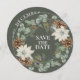 Design traditionnel avec une touche moderne. Belle charpente botanique rustique avec des pinecones et des fleurs blanches est ce traditionnel, et la carte ronde est le moderne! Téléchargez votre photo fiançailles pour le dos, ainsi que la personnalisation de la date et des noms.
