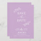 Beau mariage floral minimaliste enregistrer la carte de date dans une belle nuance de violet pâle avec texte blanc et brindilles florales dessinées à la main avec des feuilles et des petites fleurs.