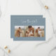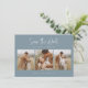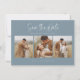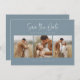 Budget Blue Simple Calligraphie Script Four Photo Save the Date dispose d'un trio de photos sur le devant, avec un type moderne et minimal. Une seule grande photo sur le dos, avec votre site mariage.