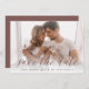 Annoncez votre date de mariage dans un style inoubliable avec cette photo élégante enregistrer les cartes de date, avec un fond de saignement photo horizontale ou orientée paysage avec "enregistrer la date" superposé en terre cuite calligraphie en lettrage sur le fond. Vos noms, date mariage et emplacement du mariage apparaissent en dessous dans les lettres modernes. Personnalisez le dos avec des détails supplémentaires, comme votre site Web mariage.