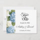 Save the Date Card is shown in a classic formal layout in the colour white with Black text and script text highlighting the Bride and Groom names and accented with a hydrangea flowers print.
