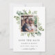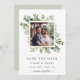 Ce mariage enregistrer la date photo d'invitation caractéristiques peint aquarelle eucalyptus, feuilles verts et un cadre carré or. Pour une personnalisation plus avancée de cette conception, cliquez sur le lien "Customiser plus loin". Des articles correspondants sont également disponibles.