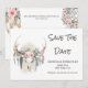 Une illustration d'un crâne de cerf sur un fond de taches d'aquarelle beige est imprégnée de plumes d'oiseaux sauvages, de feuilles, de cristaux et de glands. De jolies roses florales roses, des fleurs d'anémone et de la verdure reposent sur son front et des modèles de texte brun gras apparaissent à sa droite pour votre texte personnalisé. Les coins supérieurs arrière sont ornés de plumes tribales et de capteurs de rêves suspendus, ornés de bouquets de feuillage de rose. Idéal pour les mariages tribaux, country western, rustiques, en plein air, boho | bohèmes, en forêt et dans les bois.