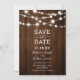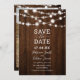 Bois brun rustique et lumières à cordes blanches photo enregistrer la date. Parfait pour un petit mariage décontracté cool pour l'automne et l'hiver, pour un thème de mariage campagnard extérieur de grange.