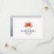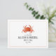 Une invitation de mariage rustique nautique enregistrer la date avec une illustration d'un crabe rouge avec du texte gris et une rayure épinglée rouge délavée sur le devant. Le dos présente un design inspiré du chambray à l'aquarelle.