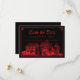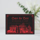 Épatez vos invités avec cette invitation gothique de mariage "save the date". Cette carte classique présente une illustration vintage fantomatique d'un château, que vous pouvez remplacer par une image de la destination où vous serez mariés (fond transparent préférable). Une police de caractères blackletter calligraphique affiche les noms des mariés, la date et le lieu. Une bordure dessinée à la main entoure le design. La palette de couleurs est rouge sang sur fond noir.