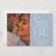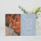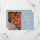 Cette invitation de mariage à save-the-date avec écriture élégante bleu poussiéreux peut être personnalisée avec vos deux photos spéciales, les informations de votre jour de mariage et le code QR de votre site web de mariage. Conçu par Thisisnotme©