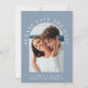Carte de faire-part de mariage moderne bleu poussiéreux avec votre photo dans un cadre en arche entouré de "Merci de sauvegarder la date" en texte blanc élégant. Sous votre photo, ajoutez vos prénoms, date et lieu de mariage. Au verso, personnalisez les détails du faire-part dans une typographie blanche simple et entrez l'adresse URL de votre site web de mariage pour créer un code QR scannable pour que vos invités puissent facilement visiter votre site web.