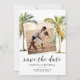 Cartes de sauvegarde de date de destination d'été ! Conçues avec un simple fond blanc, 2 photos des mariés, des palmiers aquarelles tropicaux, un code QR (remplacez-le par le vôtre) et un modèle élégant facile à personnaliser.