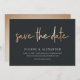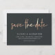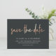 Une carte de date moderne pour les couples ou les mariages de ville haut de gamme. "Enregistrer la date" apparaît en fausse feuille de cuivre décontracté écriture manuscrite. Personnalisez avec vos noms, date mariage et emplacement du mariage en dessous en lettres blanches sur un arrière - plan noir doux.