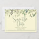 Moderne Enregistrer la Date annonces comprennent aquarelle aquarelle d'eucalyptus feuille bordure sur arrière - plan crème avec des blocs de texte personnalisables en vert dans les polices modernes. Ajoutez le code QR du site de mariage personnalisé à l'arrière.