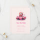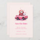 Save the date card with an adorable illustration. A happy looking sloth sitting in a sporty pink convertible. Waving as he drives by. With hearts floating upwards.