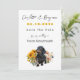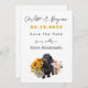 Enregistrez la date mariage faire-part modèle avec Dachshund design chien. Customisez votre événement mariage en utilisant cinq lignes de texte en script et des polices imprimées en noir et jaune tournesol. Les prénoms en haut avec des numéros ronds pour la date, en or jaune. Un mignon chien noir se dresse au milieu des tournesols et des fleurs sauvages dans le design au fond. Parfait pour un mariage de printemps ou d'été. Modifiez facilement la couleur du texte dans l'outil de conception ou demandez-moi de l'aide.