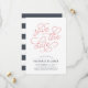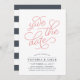 Simple et élégant, notre mariage Romantic Request enregistrer la carte de date caractéristiques "enregistrer la date" dans la typographie de script rose corail avec un coeur chic travaillé dans le design. Ajoutez les détails de votre mariage, y compris les noms, la date du mariage, l'emplacement et le site Web, en lettres gris-bleu poussiéreux. Les cartes renversent vers les rayures horizontales modernes en bleu marine et blanc.