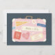 Une carte de destination enregistrer la date avec des personnalisations de texte amusantes et des illustrations d'une valise rose.
