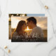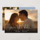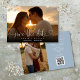 Cette élégante photo de script coeur enregistrer la carte de date comprend votre photo et un script enregistrer la date au-dessus de vos noms, date et lieu. Le verso comporte une photo, un message et un code QR du site web mariage sur un arrière - plan bleu poussiéreux. Conçu par Thisisnotme©