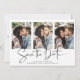 Modern manuscrit Enregistrer la Date Multiple Carte photo dans une police qui est élégant et évoque une sensation romantique manuscrite. Conçu pour utiliser trois de vos photos préférées pour une personnalisation supplémentaire. Ajoutez facilement vos noms et dates pour un design vraiment personnalisé.