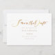 Cette carte blanche élégante de sauvegarde de la date présente une écriture calligraphique or élégante sauvegarder la date au-dessus de vos détails présentés dans une typographie élégante. Conçue par Thisisnotme©