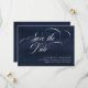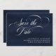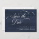 Cette élégante carte de rappel de mariage à conserver présente une calligraphie moderne tourbillonnante en blanc sur un fond riche bleu foncé.