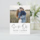 Carte de mariage moderne et élégante pour sauver la date. La carte d'invitation pour sauver la date comprend une typographie manuscrite blanche et un design chic et simple sur fond blanc auquel vous pouvez ajouter votre photo de fiançailles personnalisée.