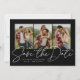 Avec trois photos verticales et un script moderne écrit "enregistrer la date", cette carte est le moyen idéal pour annoncer votre fiançailles et le prochain mariage à vos amis et votre famille. Le texte blanc chic est audacieux et moderne mais toujours sophistiqué. Le texte personnalisable sur le devant a de la place pour les noms, la date, l'emplacement et d'autres informations comme un site Web mariage. Le dos est un motif rayé noir et blanc assorti. La couleur est modifiable en cliquant sur "Personnaliser".