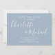 Doté de noms de style signature, cet élégant bleu poussiéreux enregistrer la carte de date peut être personnalisé avec vos informations spéciales de mariage dans la typographie chic et votre photo spéciale au verso. Conçu par Thisisnotme©