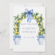 Marquez vos calendriers pour un mariage à retenir ! Cet élégant Save the Date présente de jolis accents avec des citrons vibrants créant une belle arche évoquant l'amour d'un jardin baisé de soleil. Des topiaires élégants dans de superbes vases bleus ornés de chaque côté apportent une touche de sophistication et de charme européen. Avec une typographie raffinée qui améliore le design, cette carte donne le ton d'une célébration remplie d'amour, d'élégance et de beauté intemporelle.