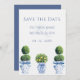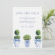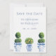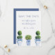 Marquez vos calendriers pour un mariage à retenir ! Cet élégant Save the Date présente de jolis accents aux citrons vibrants, évoquant l'amour d'un jardin baisé au soleil. Des topiaires élégants dans de superbes vases bleus ornés de chaque côté apportent une touche de sophistication et de charme européen. Avec une typographie raffinée qui améliore le design, cette carte donne le ton d'une célébration remplie d'amour, d'élégance et de beauté intemporelle.