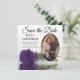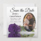 Ces magnifiques cartes de dates sont le moyen parfait pour que vos amis et votre famille connaissent votre prochain mariage. Elles présentent un design floral à la fois moderne et élégant, avec un seul rose de couleur violet royal à long tige réfléchissant dans un bassin d'eau avec des vagues et des ondulations avec votre photo dans un cadre ovale. La légende indique Enregistrer la date avec de l'espace pour vos noms, la date et l'emplacement sur un arrière - plan blanc classique. Le dos est marbré violet foncé.