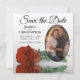 Ces magnifiques cartes de dates sont le moyen parfait pour que vos amis et votre famille connaissent votre prochain mariage. Elles présentent un design floral à la fois moderne et élégant avec un seul rose orange rouille longue ou couleur brulé se reflétant dans un bassin d'eau avec des vagues et des ondulations avec votre photo dans un cadre ovale sur un arrière - plan blanc classique. La légende indique Enregistrer la date avec de l'espace pour vos noms, la date et l'emplacement. Le dos est marbré de couleur orange citrouille.