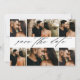 Élégant Script Mariage Photo Collage Enregistrer la Date avec une belle calligraphie script sur le devant. Le dos a les noms des couples et les détails mariages et le site Web. Cliquez sur le bouton Modifier pour customiser cette conception.