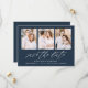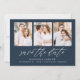 Annoncez vos nouveautés dans le style avec notre Elegant Script photo enregistrer la carte de date. L'élégant enregistrer les cartes de date affiche 3 de vos photos fiançailles préférées avec "enregistrer la date" dans un script de calligraphie moderne blanc contre un arrière - plan de marine. Personnalisez la carte en ajoutant vos noms, votre date de mariage et votre emplacement de mariage. Le minimaliste enregistrer la carte de date revient à un arrière - plan de marine solide ou une couleur de votre choix.
