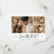 Élégant minimaliste de typographie moderne Script 3 Collage de photos Enregistrer les cartes de dates en noir et blanc. Ce design romantique et délicat est parfait pour un mariage moderne. Caractéristiques 3 (trois) grille photo collage, une calligraphie whimsical cursive dans le style lettré à la main la police de la queue de swash et coeur d'amour. Facile à personnaliser avec vos détails et photos mariages.