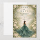 This elegant quinceañera design features a soft emerald green watercolor background framed by romantic ivory roses, delicate greenery, and subtle gold accents, with a graceful gown illustration creating a refined, enchanted garden atmosphere. The rich green palette combined with classic florals gives the design a luxurious yet youthful feel, perfect for a timeless quinceañera celebration with a romantic, nature-inspired aesthetic.