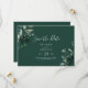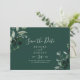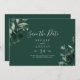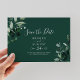 Cette carte de sauvegarde de date de mariage à l'horizontale avec une verdure émeraude est parfaite pour un mariage bohème. Le design élégant mais rustique présente des feuilles de couleur vert foncé et de l'eucalyptus dans un style aquarelle avec une ambiance moderne de forêt bohemienne.