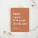 Enfin une Partie Texte Simple Terracotta Minimaliste Enregistrer la Date. Un design simple et moderne met en évidence ce texte modifiable en couleur ! Enfin. Une fête. Avec les gens. Save the date! Avec une jolie texture de marbre sur le côté arrière, mais peut être remplacé par votre propre photo. ~ Regardez ma boutique pour voir l'ensemble de la suite mariage pour ce design!
