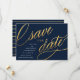 Ces cartes de sauvegarde de date uniques et modernes présentent un script fantaisiste dans un effet de feuille d'or faux sur un fond bleu marine foncé, avec les détails de l'annonce de mariage en blanc. Le dos présente un motif de rayures bleu marine et or tendance. Changez la couleur de fond à l'aide de l'outil "Personnaliser" !