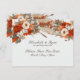 Teintes chaudes d'automne orange, marron, vert et corail, herbe de blé, herbe à pompons, chrysanthèmes et fleurs blanches, carte de sauvegarde de date de mariage d'automne.